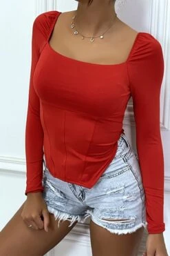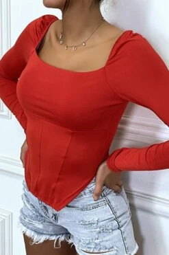 T-shirt manches longues rouge à style corsé à col carré. Agréable à porter et simple à accessoiriser.