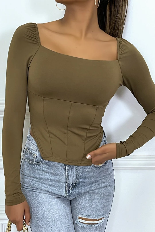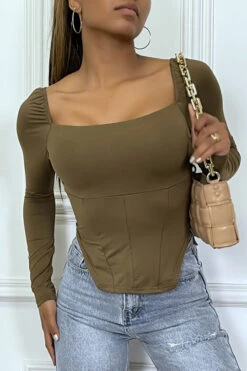 T-shirt manches longues taupe à style corsé à col carré. Agréable à porter et simple à accessoiriser.