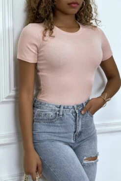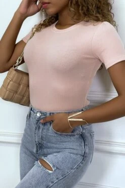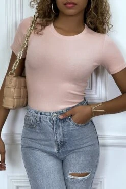 T-shirt moulant rose à manches courtes, col rond. AgrĂ©able Ă porter, ce basic est simple Ă accessoiriser.Â
