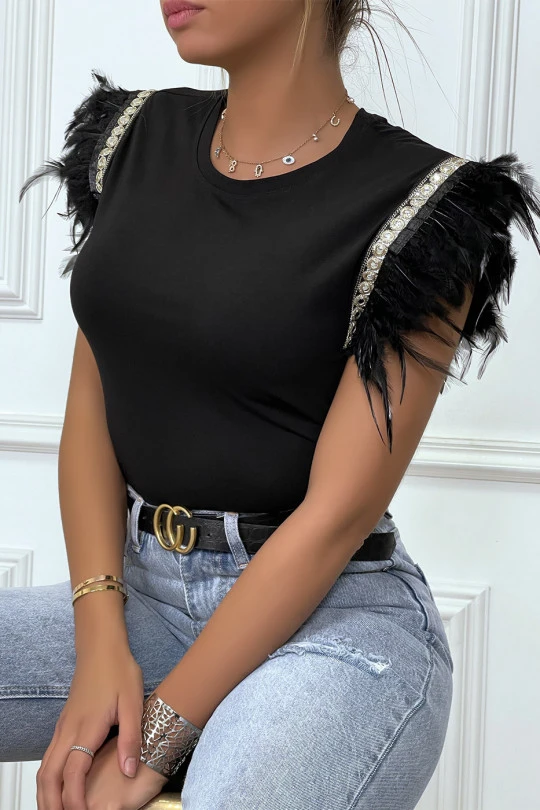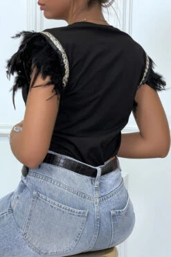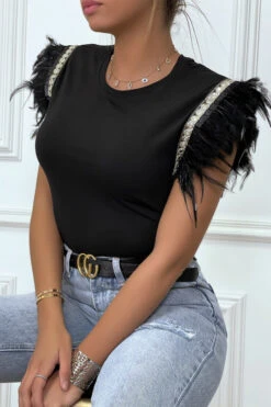 T-shirt noir sans manches avec plumes et détails doré. Tendance avec ses détails, ce t-shirt est agréable à porter.