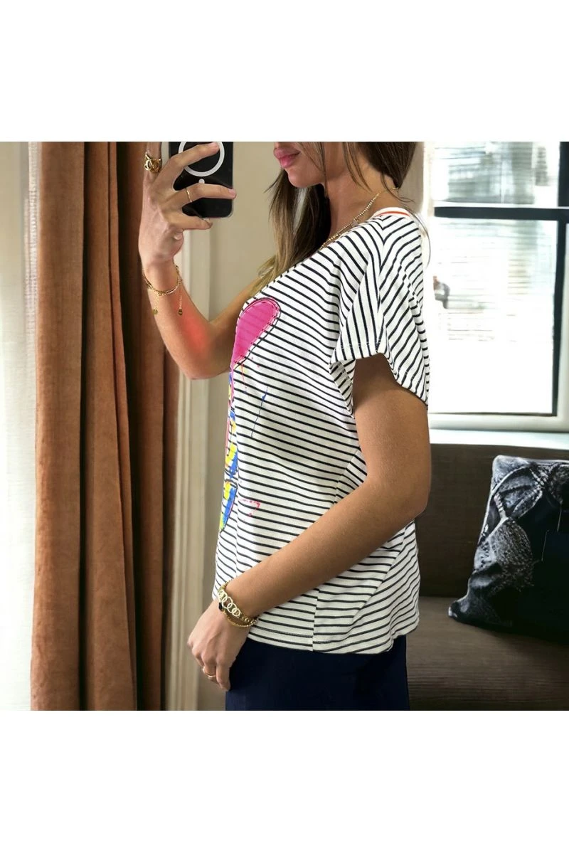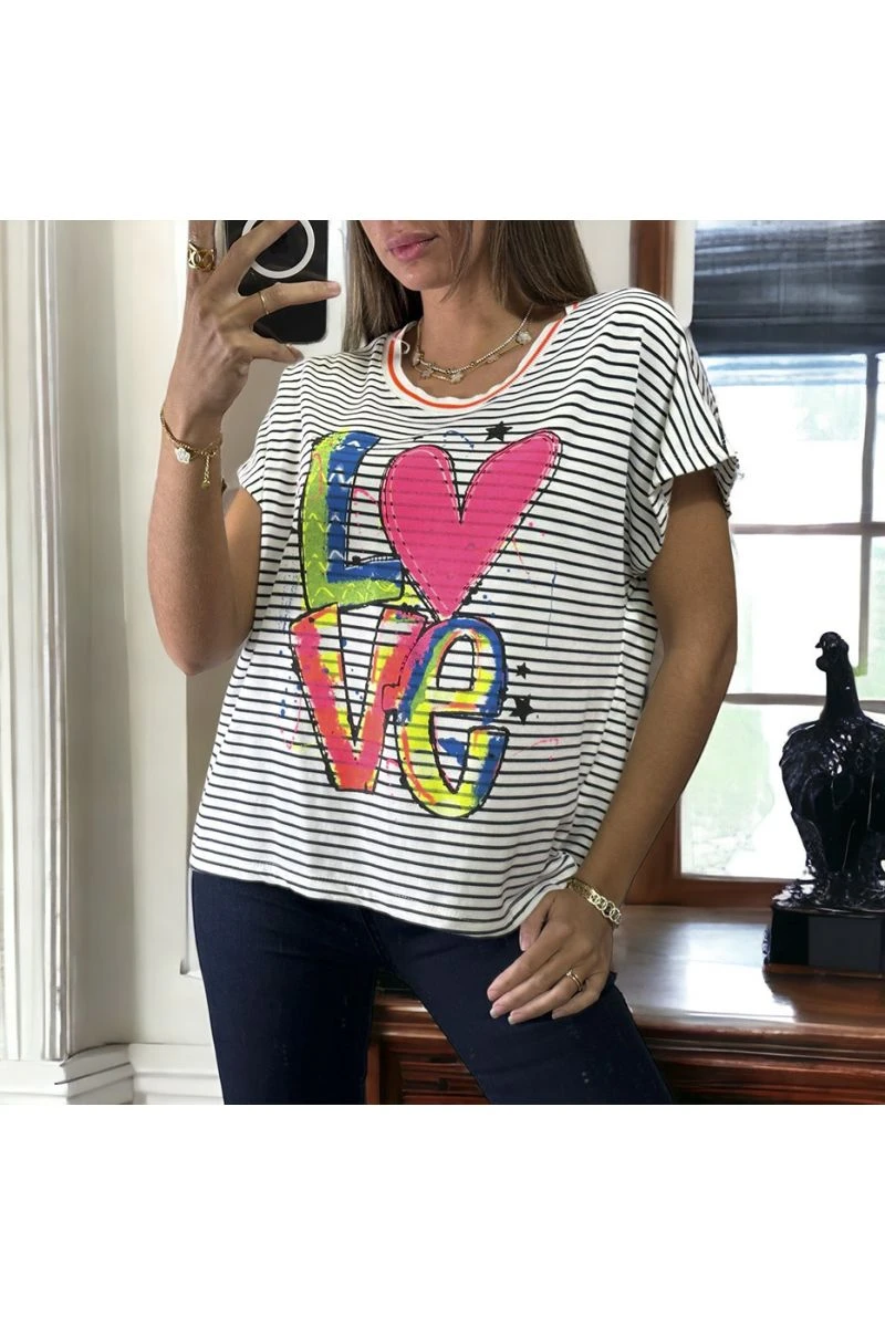 T-shirt rayé noir et blanc en coton avec écriture LOVE