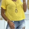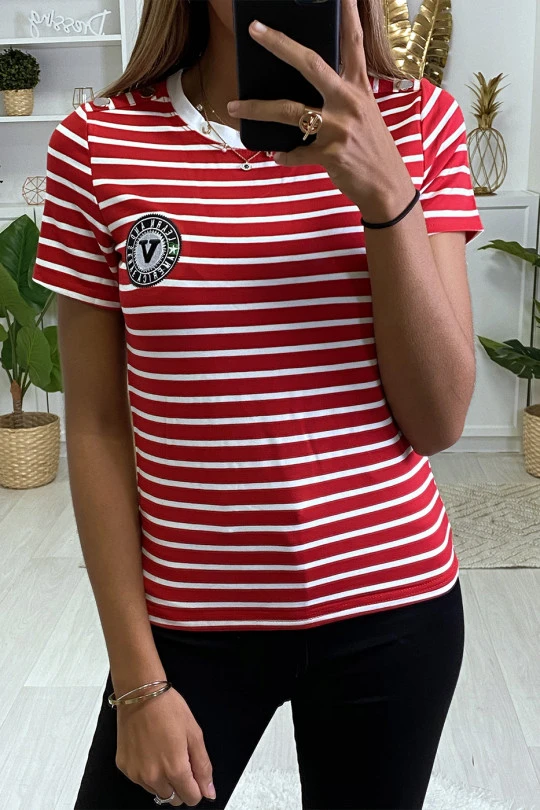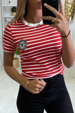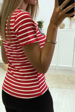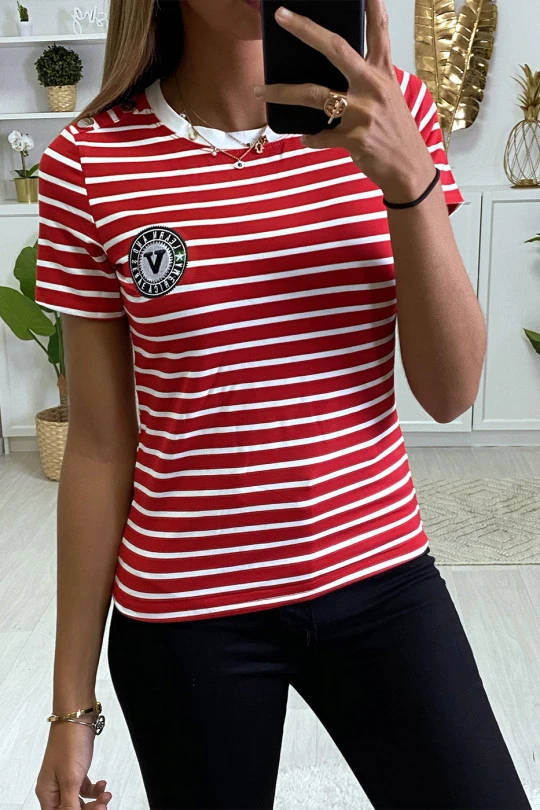 T-shirt rouge et blanc style marin avec boutons à l’épaules. Mode femme pas cher