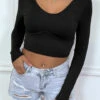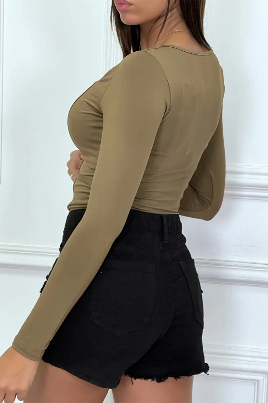 T-shirt taupe manches longues à col carré. Simple à accessoiriser et simple à porter.