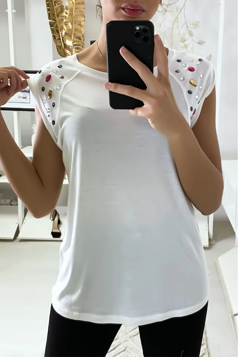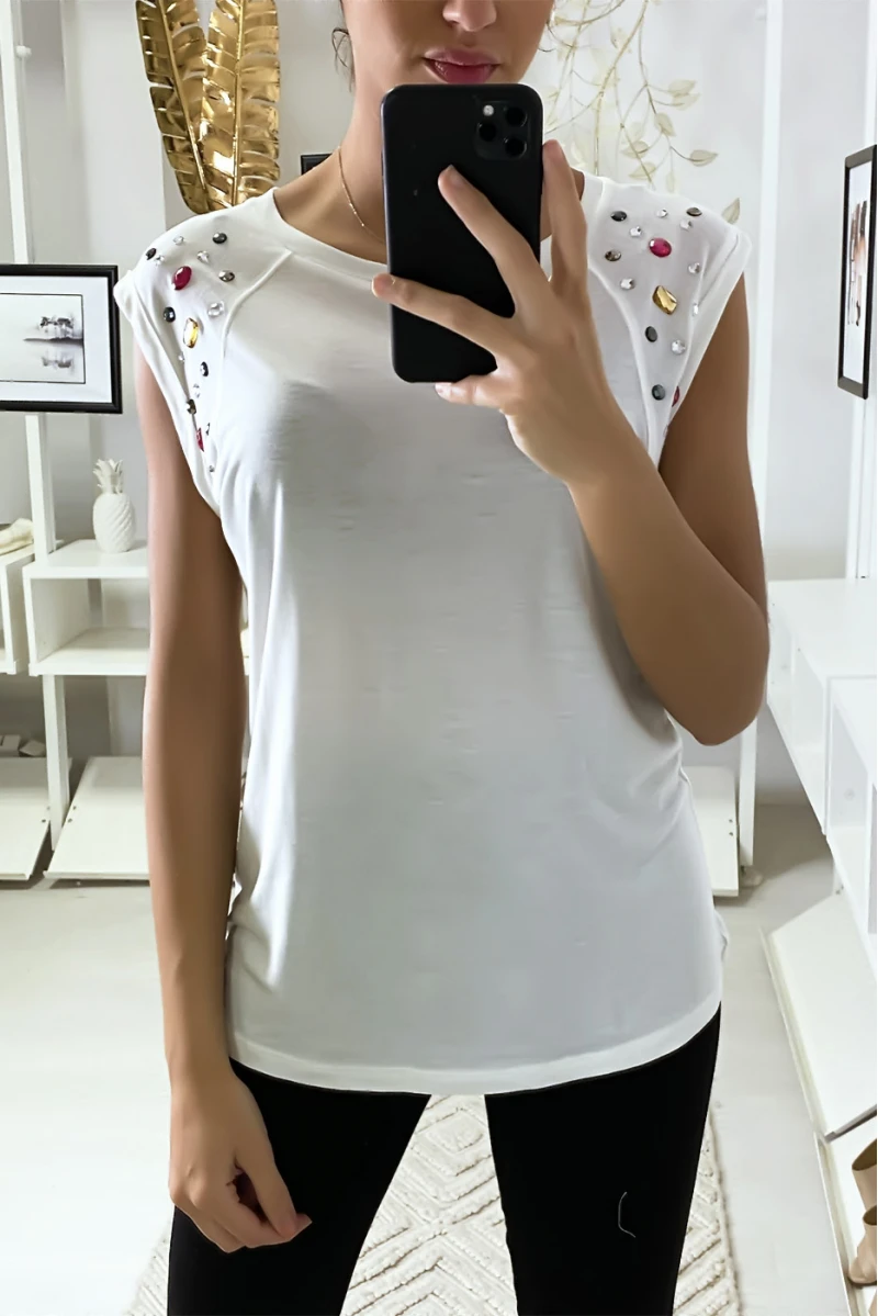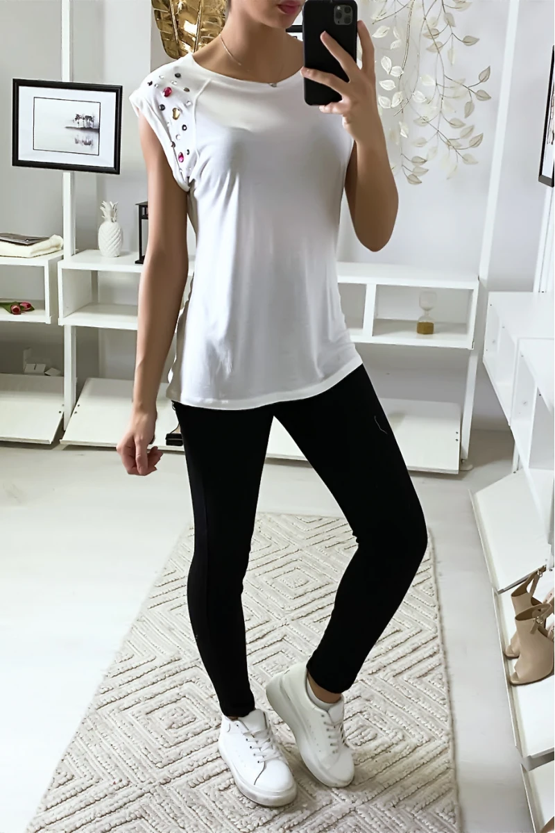Joli T-shirt blanc très chic avec de jolis strass aux Ă©paules. Mode pour femme tendanceÂ