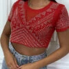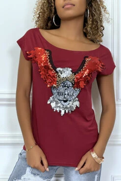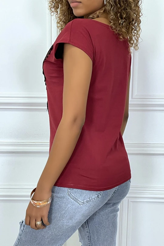 Tee-shirt bordeaux Ă dessins aigle en sequins et perles