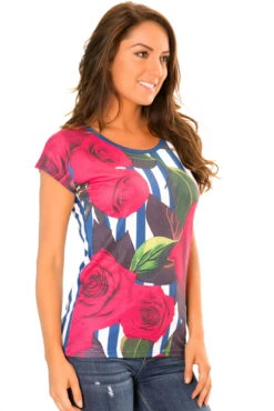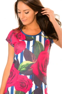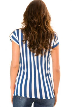 Mega destockage Tee shirt fluide a rayure Bleu marine, Blanc a motif fleurs – MC1664