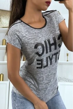 Tee-shirt gris avec details, en simili et écriture . Pret à porter pour femmes , vetement hyper tendance .