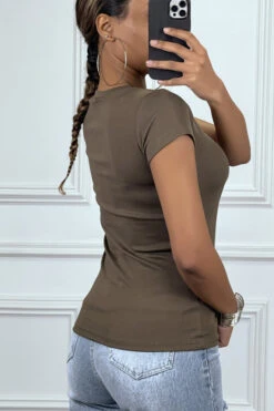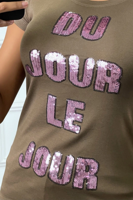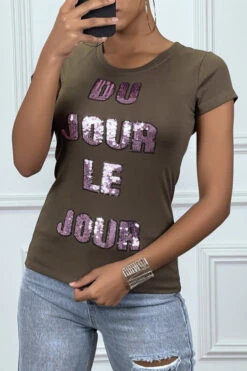 Tee-shirt kaki avec écriture en sequins rose