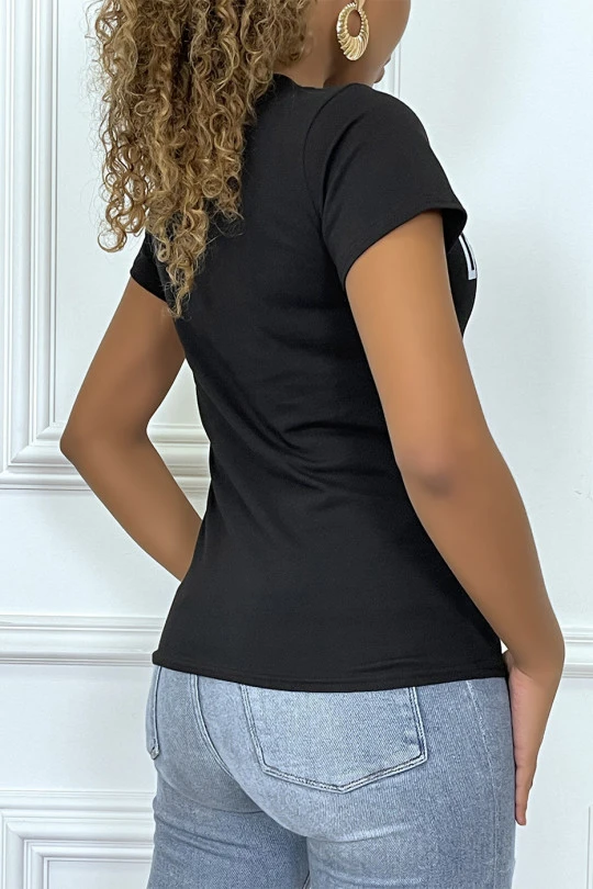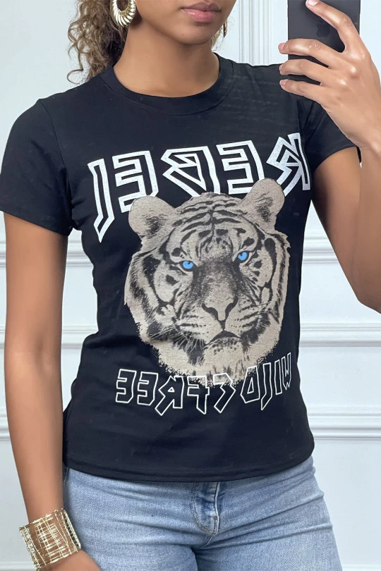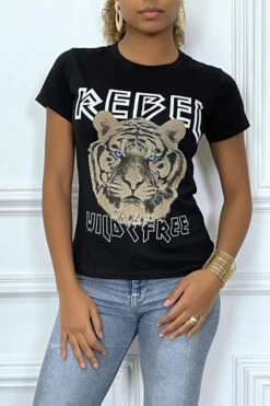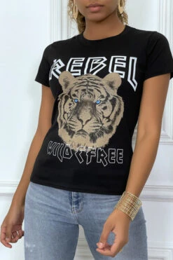 Tee-shirt noir cintrée avec écriture REBEL et tête de lion