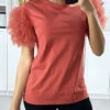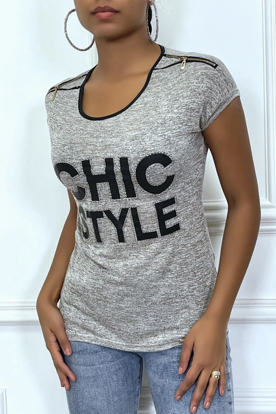 Tee-shirt taupe avec details, en simili et écriture . Pret à porter pour femmes , vetement hyper tendance .