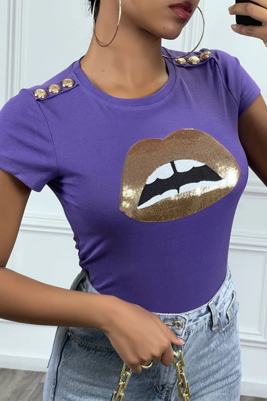 Tee-shirt violet avec dessins et boutons dorée
