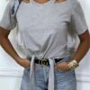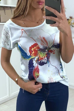 Teeshirt bleu fluide Ă dessin et epaules dentelles