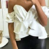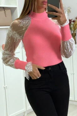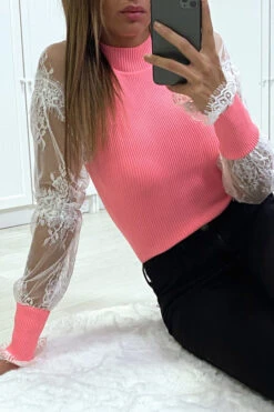 Top Cotelé Fuchsia à Manche Blanche Dentelle