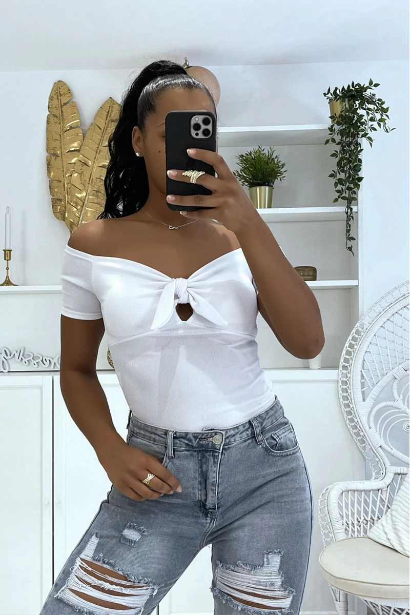 Top court blanc avec coque à la poitrine et joli noeud manches courtes et épaules dénudées