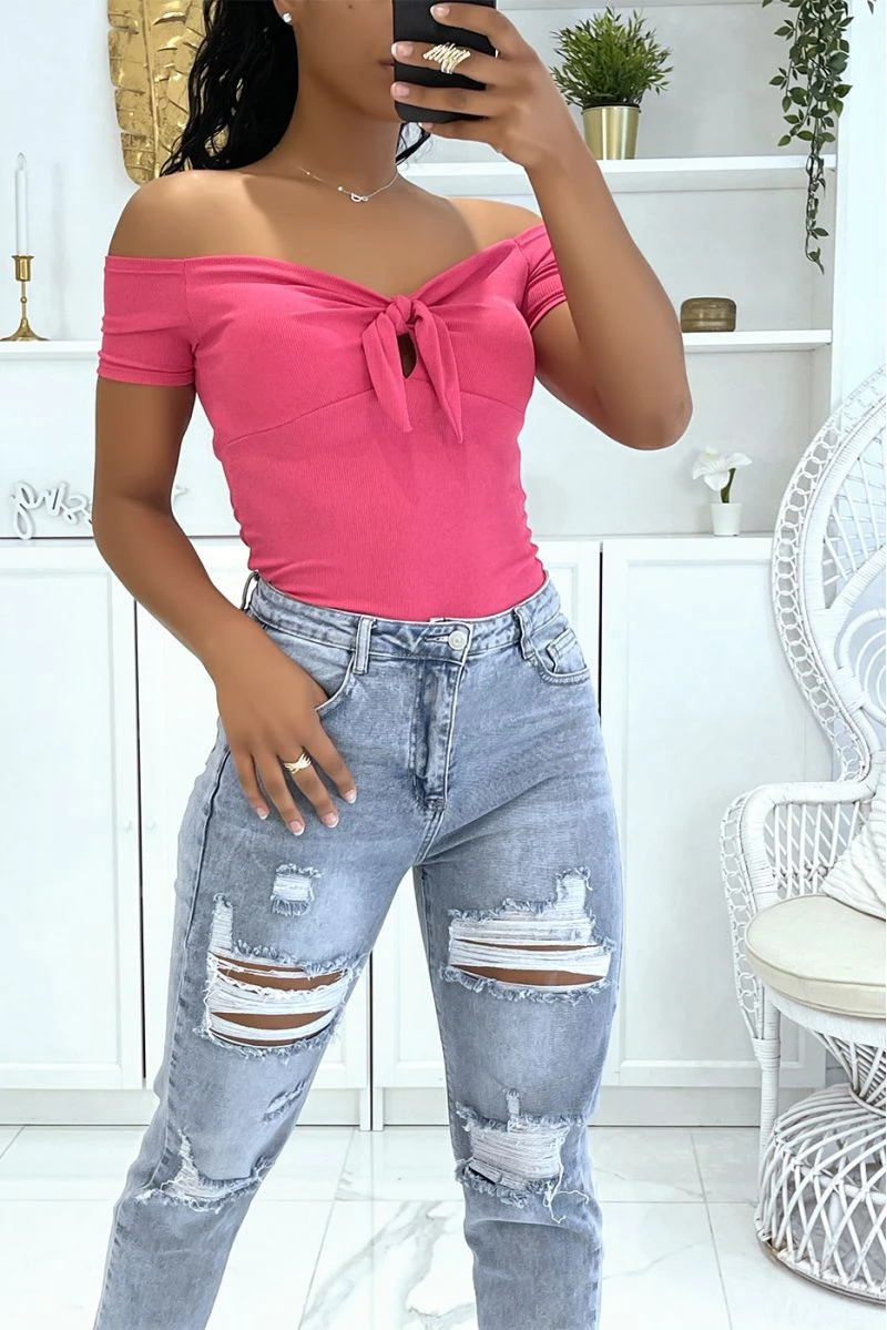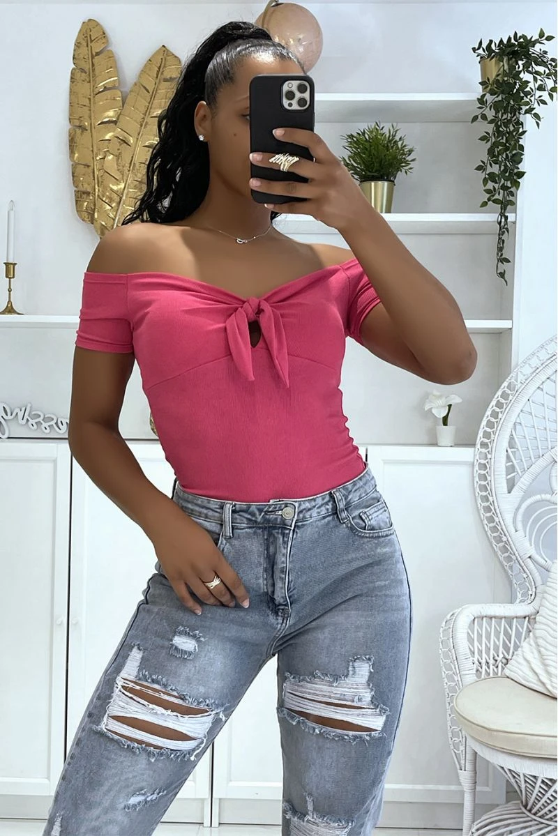 Top court fuchsia avec coque à la poitrine et joli noeud manches courtes et épaules dénudées