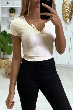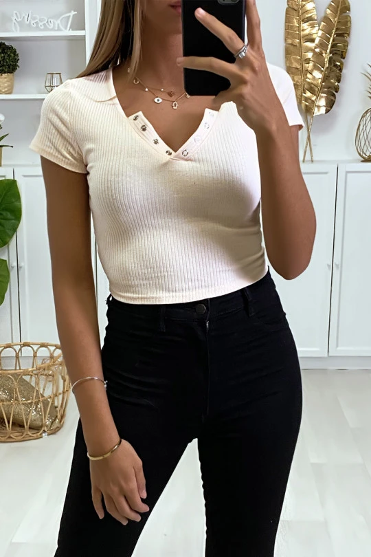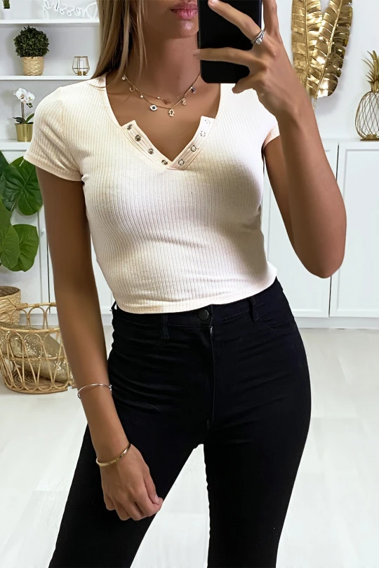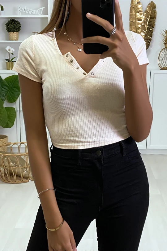 Top court saumon côtelé à col V avec boutons pressions décoratifs.