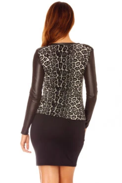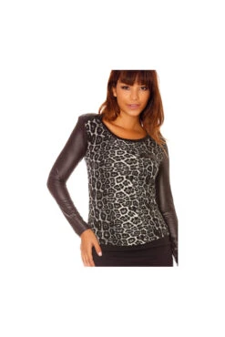 Top Gris Motifs Léopard, Bi-matières Et Manche Longue. 2530