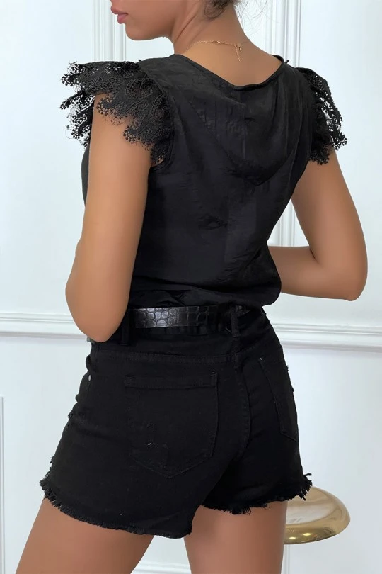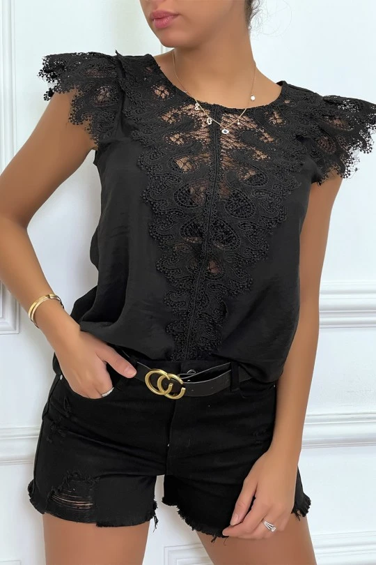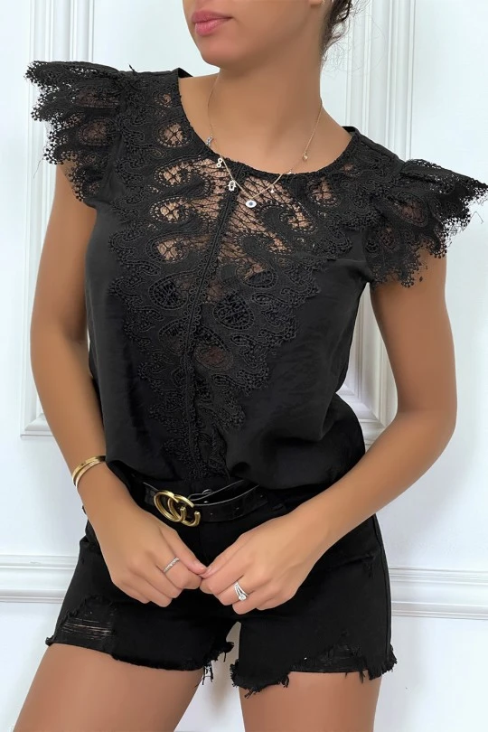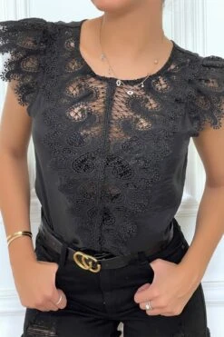 Top noir avec dentelle devant et volant aux Ă©paules. Vetement femme Â