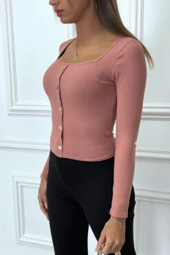 Top rose foncé côtelé à col plongeant et boutons dorés fantaisies, superbe top à manches longues idéal avec un pantalon slim