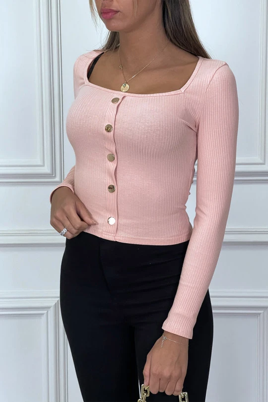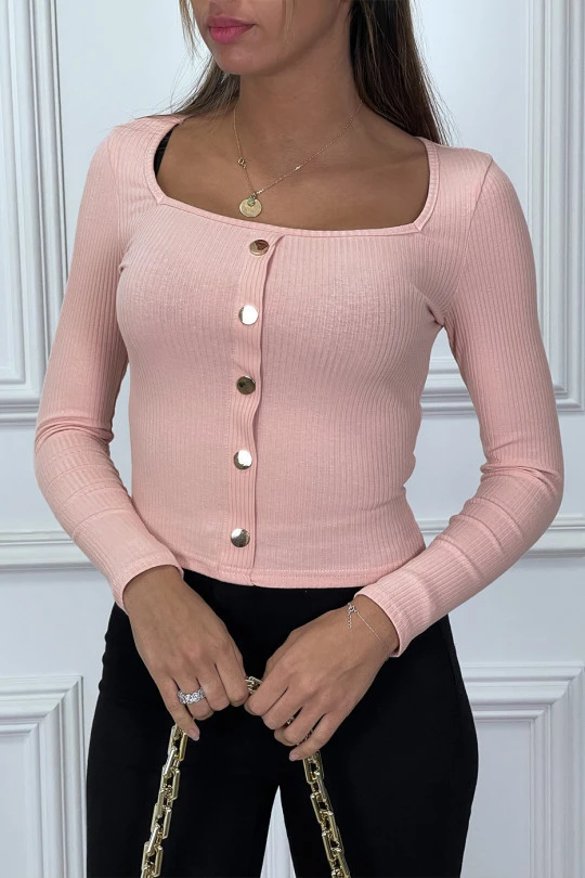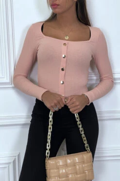 Top rose poudré côtelé à col plongeant et boutons dorés fantaisies, superbe top à manches longues idéal avec un pantalon slim