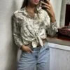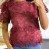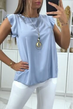 Top turquoise en voile plissé au dos et manches courtes à volants, idéal pour les beaux jours.