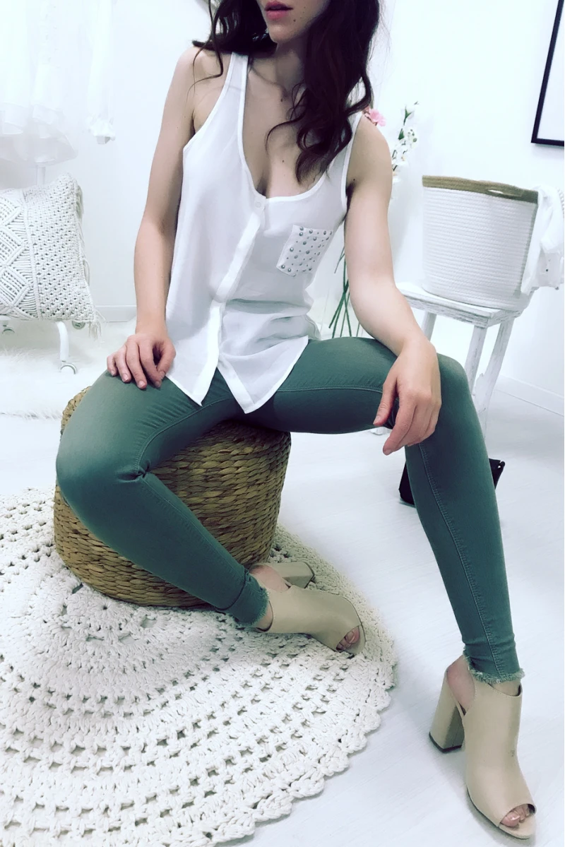 Mega destockage Chemisier sans manches blanc a poche strass et dos dentelle. F2030